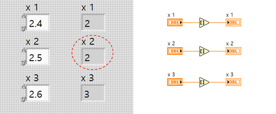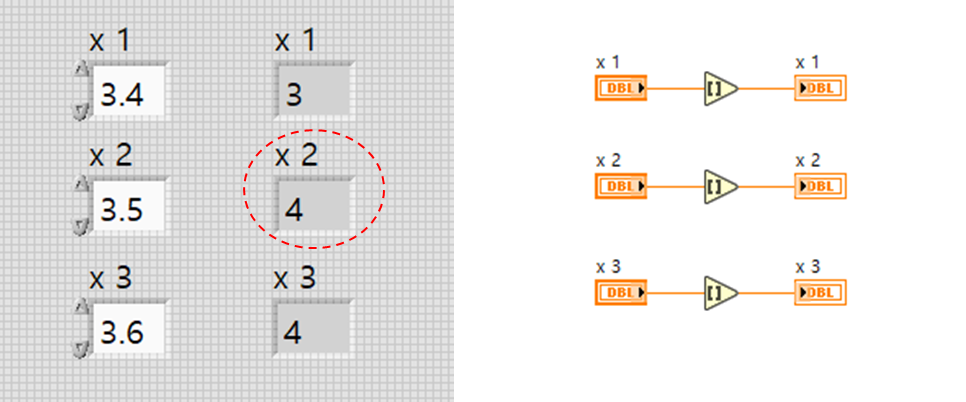 왜 IEEE 754가 널리 쓰이는지 또는 효율적인지를 설명하려면 내용이 길어지기에 해당 튜토리얼에서는 따로 다루지는 않겠습니다. 관심이 있으신 분들은 구글링으로 'IEEE 754', 'IEEE 754 인접 짝수 모드', 'IEEE 754 근사' 등을 검색하시어 부동 소수점에 대한 계산 과정을 보시면 좋을 것 같네요. 다시 LabVIEW로 돌아와서 한번 부동 소수에 대해 반올림 처리를 해보겠습니다.
