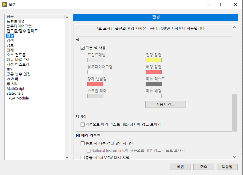 옵션 창에서 LabVIEW 색 관련 환경 설정
