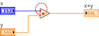 이번에는 X와 Y에 각각 I32와 SGL 컨트롤을 연결해주었습니다. 강제 변환점은 I32에 생성된 것을 확인할 수 있는데요. I32와 SGL 역시 4바이트 크기를 가지지만 이럴 경우 LabVIEW에서는 정수를 강제 변환하고 더하기 작업을 수행합니다. 개인적인 의견으로는 아마 소수점까지 표현하기 위한 실수형 데이터로 강제 변환하는 것이 아닌가 생각합니다.