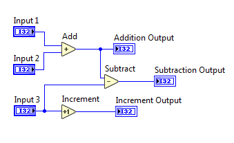 LabVIEW 데이터 흐름과 관련된 코드 문제이다. 기본적으로 LabVIEW는 위에서 아래 또는 좌에서 우로 데이터 흐름의 방향을 권장하고 있다. 해당 문제의 코드도 일단 노드([Add], [Subtract], [Increment]) 좌측에는 입력과 관련된 컨트롤들이 위치해있고 우측에는 출력과 관련된 인디케이터가 위치해있다. 따라서, 좌에서 우로 데이터 흐름을 따라가보자.