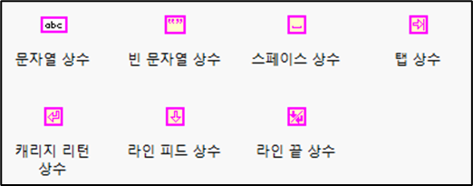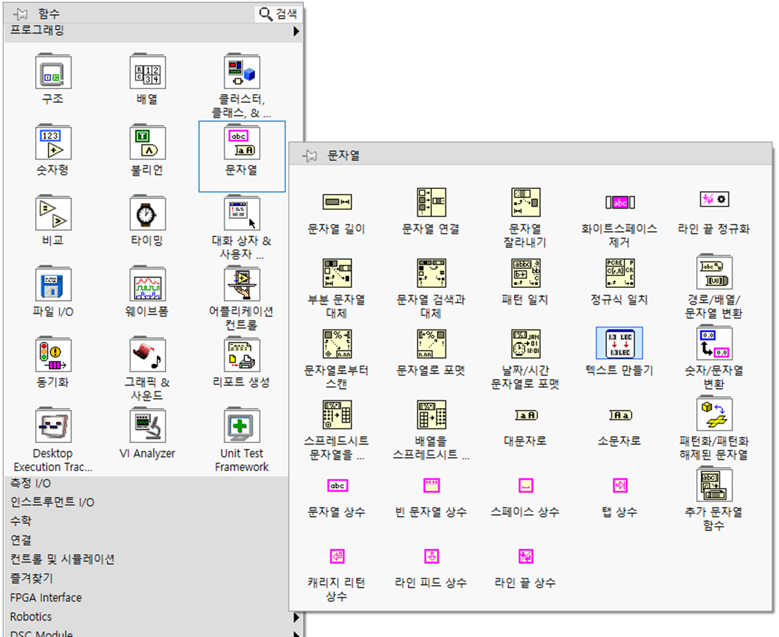 블록다이어그램에서 함수 팔레트 >> 프로그래밍 항목에서 문자열 데이터 처리에 필요한 함수들을 찾을 수 있습니다. 숫자형에서 정수형과 실수형에 따라 테두리의 색상이 다르듯이 LabVIEW에서 데이터 타입에 따라 테두리 및 와이어의 색상을 구분 짓고 있습니다. 색상만 보고도 어떤 데이터인지 알 수 있는 것이죠. 문자열 데이터는 분홍색으로 표시됩니다.