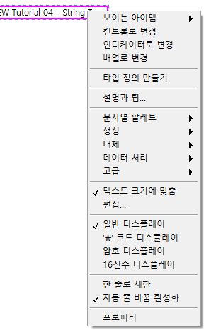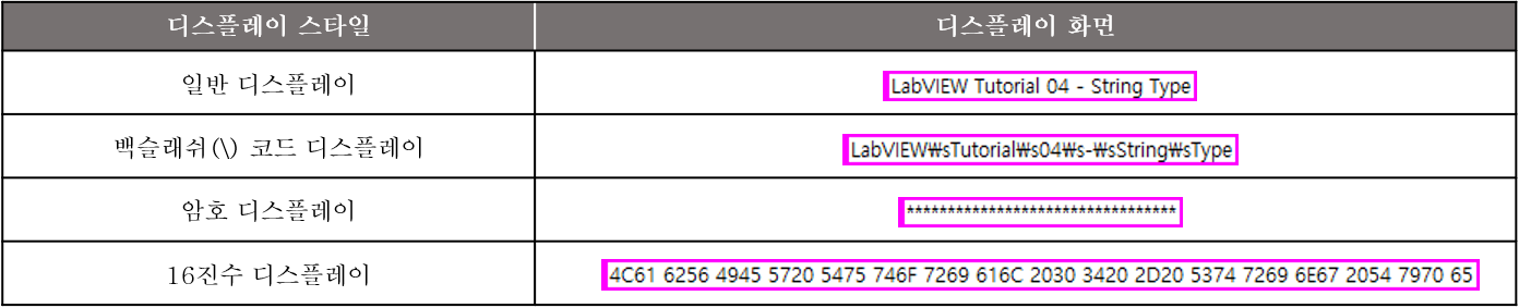 입력 문자열 'LabVIEW Tutorial 04 - String Type' 디스플레이 스타일별 화면