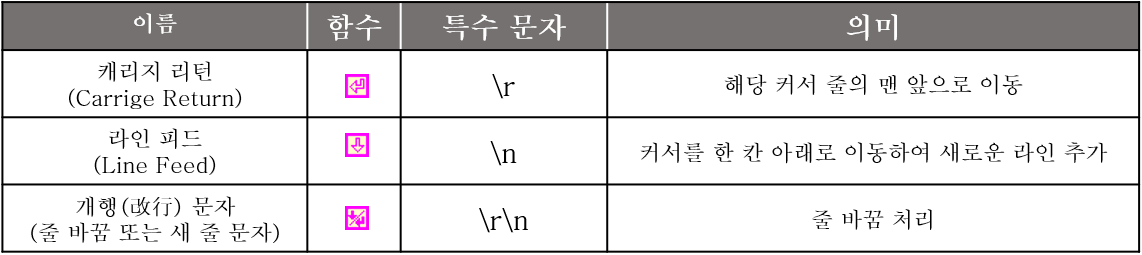 위의 이미지의 줄바꿈 관련 상수 3가지(캐리지 리턴, 라인 피드, 라인 끝) 상수들이 출력해주는 값을 백슬래쉬('\') 코드로 살펴보면 \r, \n, \r\n 으로 출력되는 것을 확인할 수 있으며 각각의 의미는 아래의 테이블 표와 같습니다.