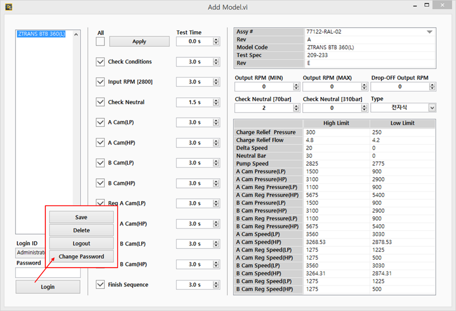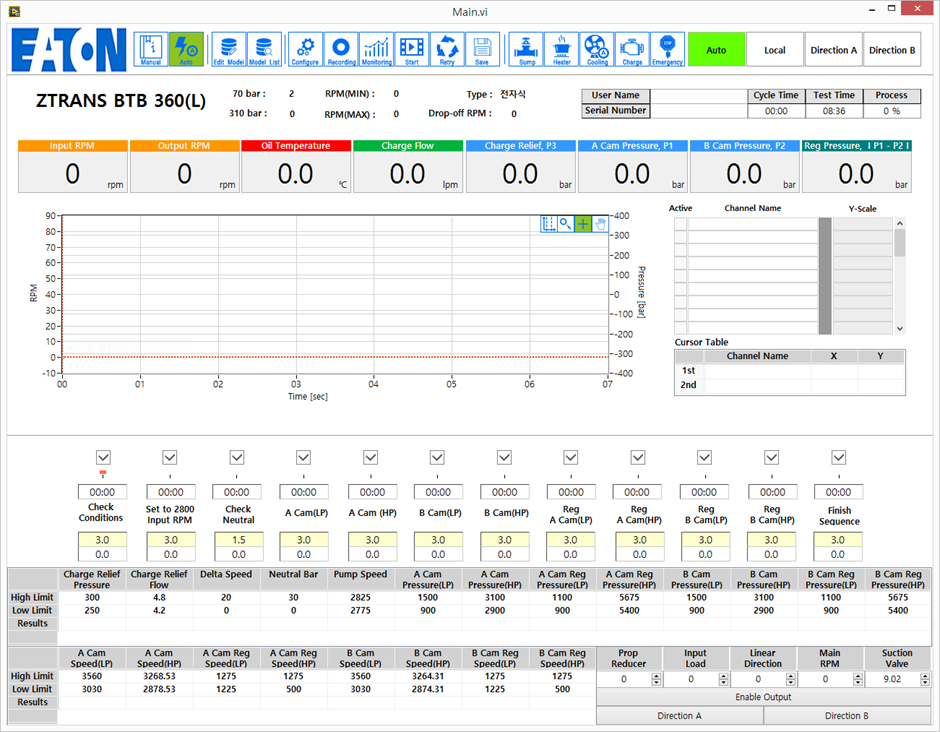 RPM, Oil Temp, Charge Flow, P1, P2, P3 데이터와 EATON Engineering Standard에 근거한 Z Transmission 양불 판정 프로그램