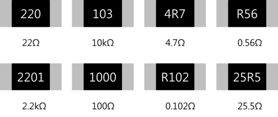 이 외에 하나만 더 소개를 하자면 보통 PCB 기판 위에는 SMD(Surface Mount Device) Register라고 칩 저항이 많이 쓰이는데 기판 위에 올려두고 솔더링만하면 되는 형태입니다. 칩 저항은 아래와 같이 표기되며 읽는 법은 3자리 SMD 코드에서는 세번째 숫자가 10의 배수를, 4자리 SMD 코드에서는 4번째 숫자가 10의 배수를 나타내는 숫자입니다. 그리고 R은 소수점 위치를 나타냅니다.