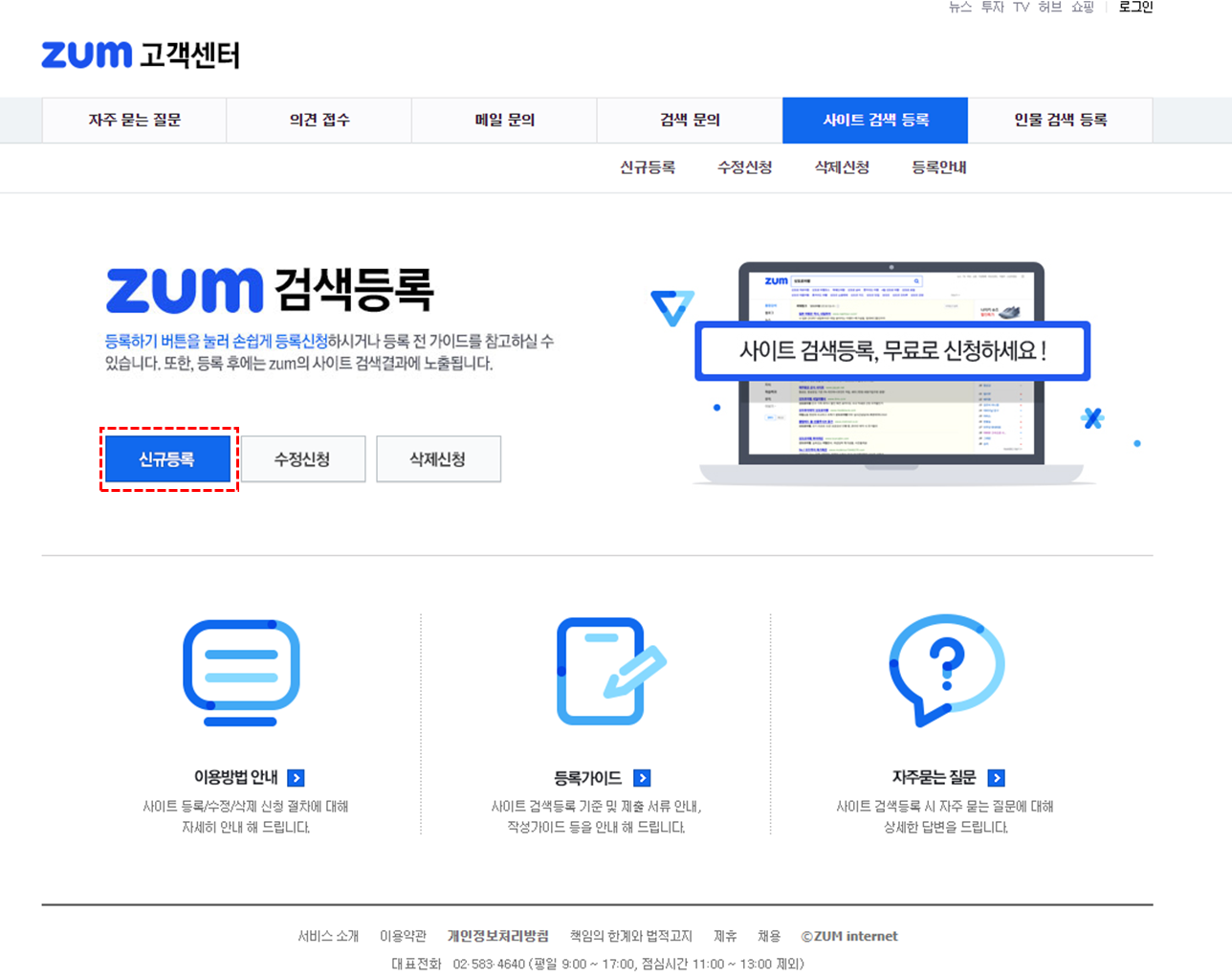 1. Zum 검색 등록 사이트에서 "신규 등록" 클릭