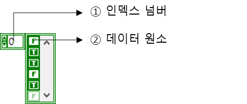 배열(Array)이란 동일한 원소들을 하나로 묶은 데이터 타입을 말하며 번호(인덱스)와 이에 대응하는 데이터들로 이루어져 있습니다. LabVIEW에서의 배열 상수로 배열의 구성을 살펴보면 각 칸마다 데이터 값이 들어가 있으며 제일 좌측 상단에 숫자 0으로 시작하는 위치 정보를 나타내는 인덱스(Index) 정보가 포함되어 있습니다.