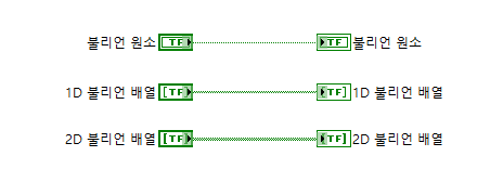 이렇게하면 원하는 데이터 타입의 배열 컨트롤을 생성하게 되고 블록다이어그램에서는 배열 원소 타입에 따라 색상이 나타나는 것을 확인하실 수 있습니다.