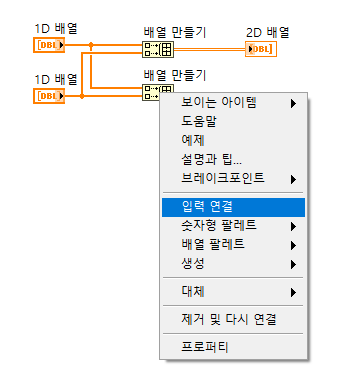 [배열 만들기] 함수는 두 데이터를 이어 붙일 때 또는 새로운 차원으로 데이터를 만들 때 사용하는데 이 함수는 입력 연결(Concatenate Inputs)이라고하는 옵션을 제공하고 있습니다(우클릭 메뉴로 선택 가능). [배열 만들기] 함수에서 같은 차원의 데이터를 연결할 경우 기본 입력 연결을 체크하지 않으면 입력보다 한 차원 높은 배열 타입으로 출력이 생성됩니다. 예시로 1차원 배열 두개를 가지고 [배열 만들기] 함수를 사용하면 2차원 배열이 생성되는 코드를 생각하시면 됩니다.